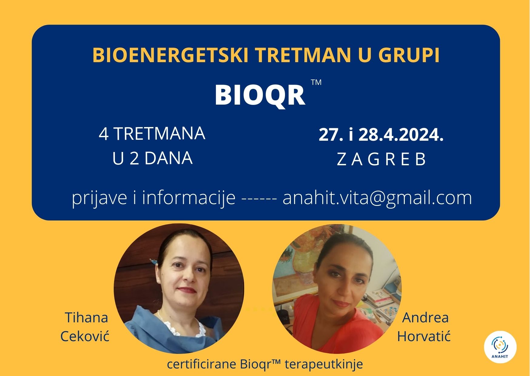Bioqr™ je prirodna metoda poboljšanja zdravlja, nema dobnih granica. Na tretmanima se ne radi dijagnostika. Mjesto na bioenergetskom tretmanu u grupi rezervirate uplatom 60 EUR za 4 tretmana. Potrebno je prisustvovati na 4 bioenergetska tretmana u grupi u subotu i nedjelju 27. i 28.4.2024. u 10 i 16 sati. Nakon završetka terapeute za njihov rad i organizaciju grupnog tretmana nagrađujete donacijom. Sva plaćanja su putem transakcijskog računa, gotovina se ne prima. Prijave i dodatne informacije molim na mail anahit.vita@gmail.com ili putem kontakt obrasca. Lokacija održavanja tretmana ovisi o veličini grupe. Svi prijavljeni do 23.4. dobit će email sa podacima o adresi.