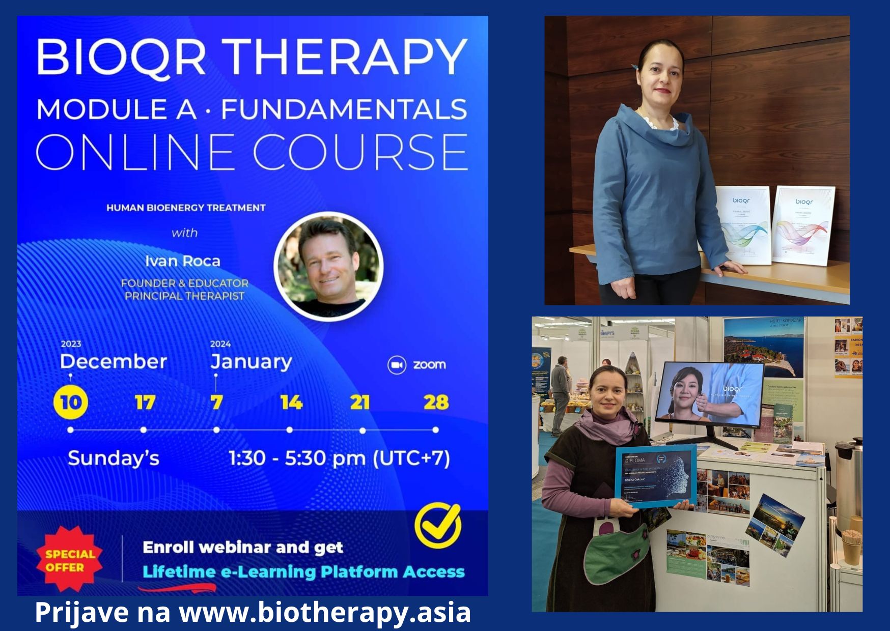 Ako mogu ja, možeš i ti naučiti bioqr™ bioenergetski tretman. Uči nedjeljom ujutro u toplini svoga doma bez traženja vize, kupovine avionske karte, rezervacije hotela i odobrenja godišnjeg odmora. Bioqr™ modul A počinje 10.12.2023. Prijavi se i kreni jer ne znaš što će ti edukacija sve donijeti i u životu na bolje promijeniti. Svi koji se pojave na popisu bioqr™ studenata nakon završenog webinara slobodno nam se pridružite na bioqr™ bioenergetskom tretmanu u grupi u veljači 2024. u Zagrebu ili lipnju 2024. na Velom Ižu. Andrea i Tihana, certificirane bioqr™ terapeutkinje, vas čekaju!