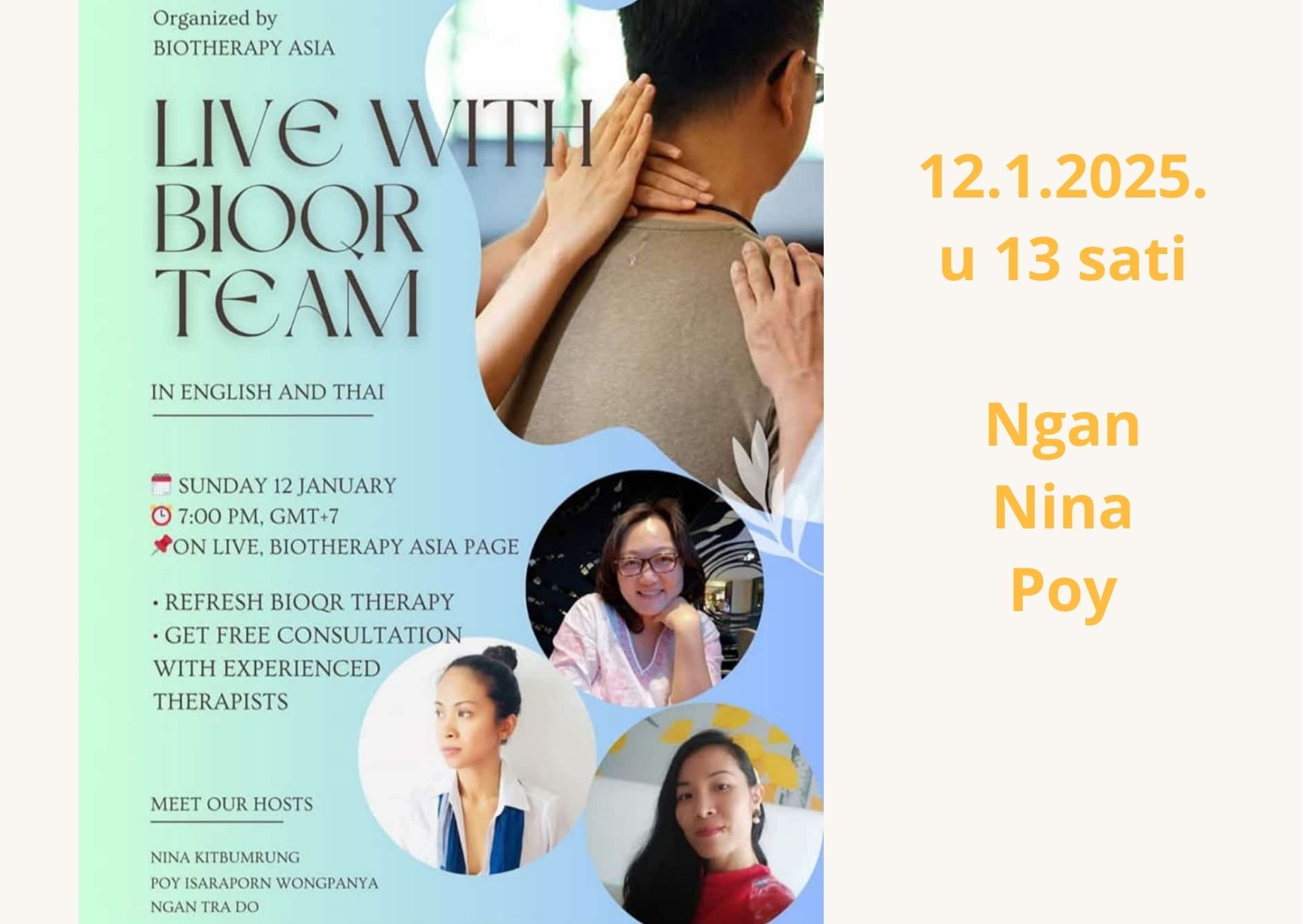 Bioqr™ certificirane terapeutkinje Ngan, Nina i Poy organiziraju u nedjelju 12.1.2025. u 13h (srednjoeuropsko vrijeme – Zagreb) razgovor i savjetovanje o Bioqr™ bioenergetskom tretmanu. Prijave na Facebooku Biotherapy Asia. Priključite se i naučite nešto novo!